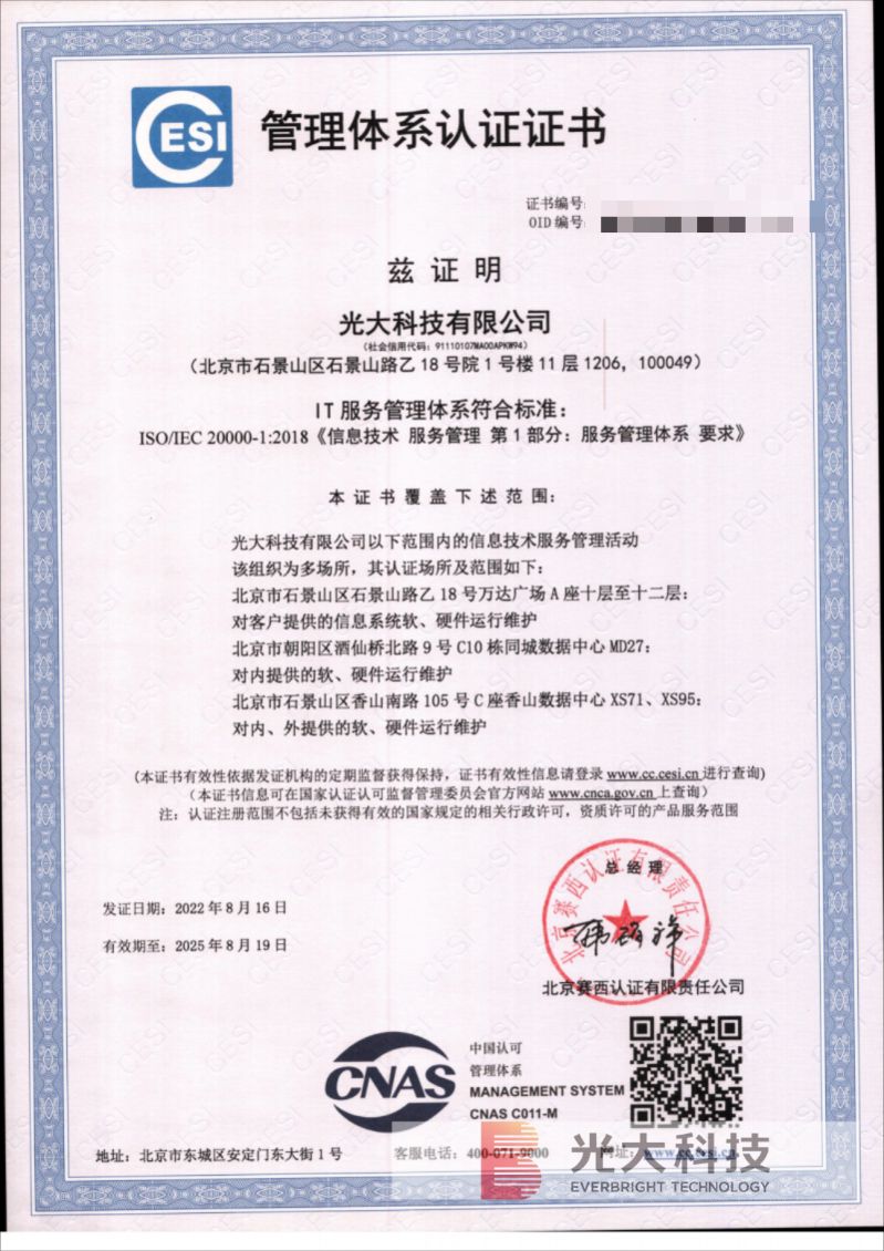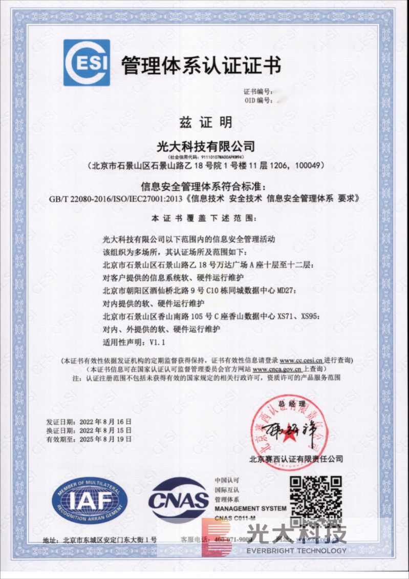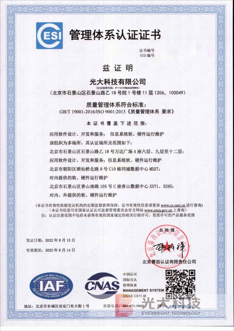 近日,光大科技成功通過了質量管理體系(GB/T?19001-2016/ISO9001:2015)認證,并再次通過信息安全管理體系(ISO/IEC?27001:2013)認證和信息技術服務管理體系(ISO/IEC?20000:2018)認證。